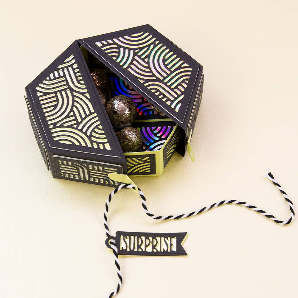 Create a beautiful heart-shaped box and a stunning hexagon-shaped box with this brand-new gift box Dimensions die set. This unique set contains 51 dies - every die you need to create and decorate your boxes! This gorgeous set features dies to add decorative panels, dies for cutting gift tags & sentiments, multi-function fastenings and added embellishments!
