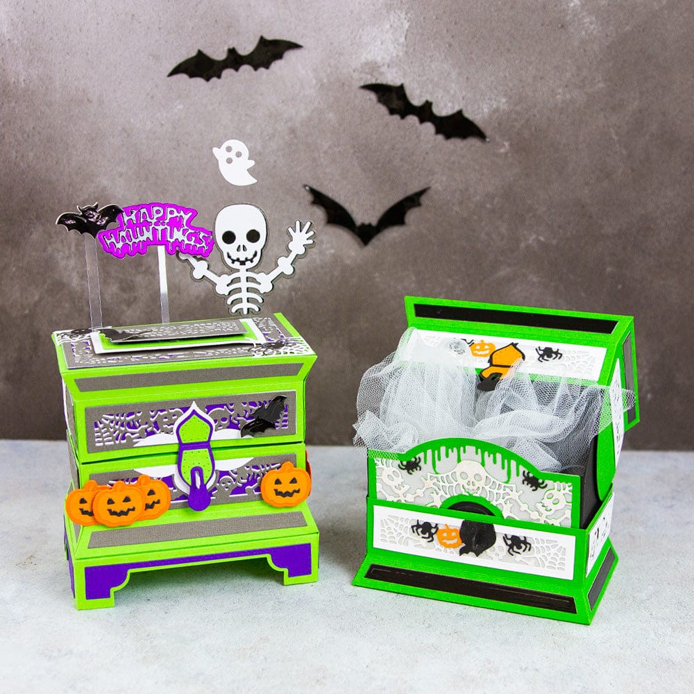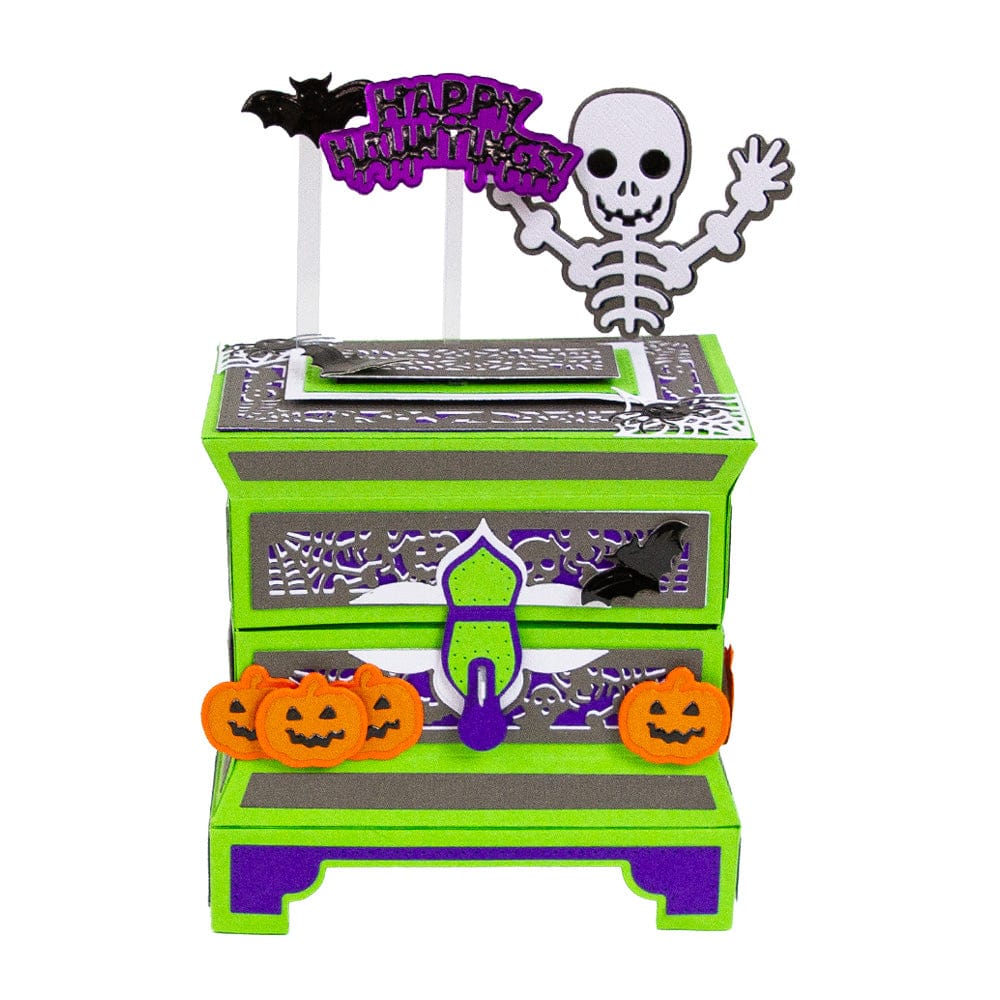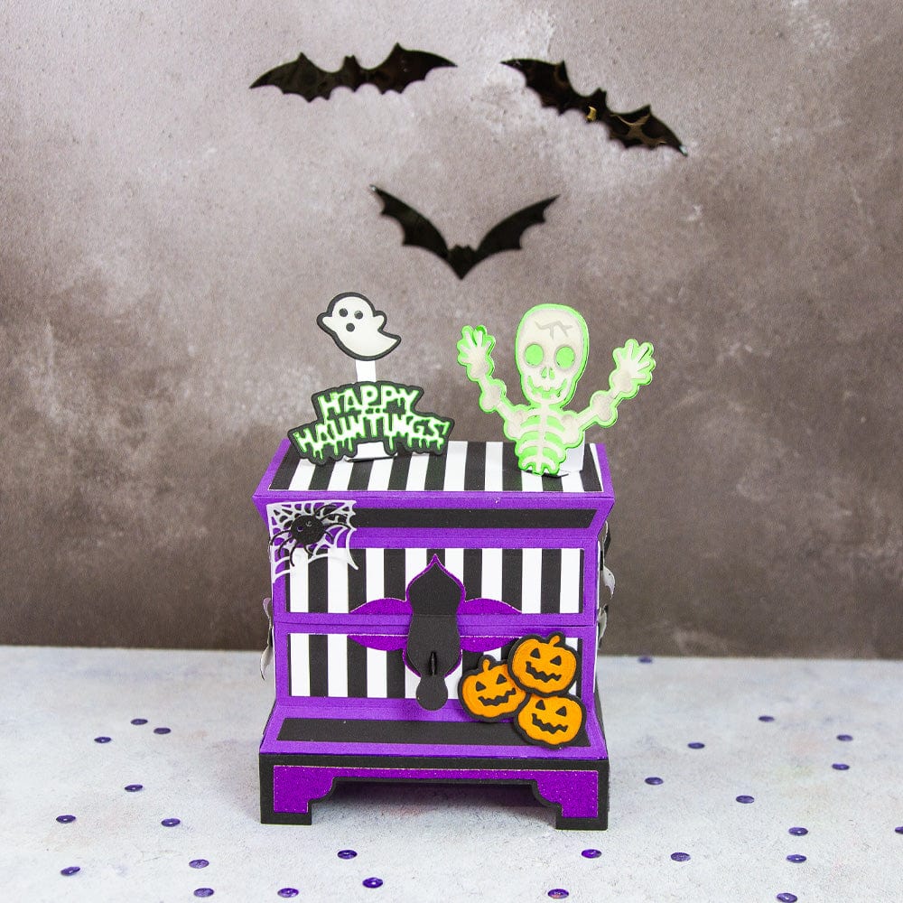 Create tremendously terrifying embellishments with this haunting add-on set! The Happy Hauntings Embellishment Die Set features 2 spooky sentiments and a collection of additional decorative elements. Perfect for crafting spine-chilling cards or adding more scares to the Sepulchre Gift Box (5646e) sold separately.